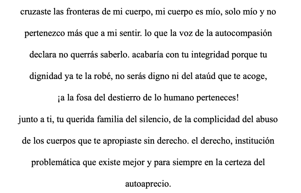 En el año 2024, viajé por Latinoamérica y estando en el Cajón el Maipo en Chile, sentí que era el momento de terminarlo. Había estado en una cascada sobre la que hay muchas leyendas acerca de las almas que quedaron atrapadas y siguen hablándonos en las noches de luna llena. Sentí que era el momento: mi texto es una invocación de las voces que fueron silenciadas, es un despertar demoníaco y angelical. Es el paso del Cielo al Infierno como un círculo sin final, el yin y el yang de la Biblia reinterpretada, a mi manera, y solo a mi fucking manera.